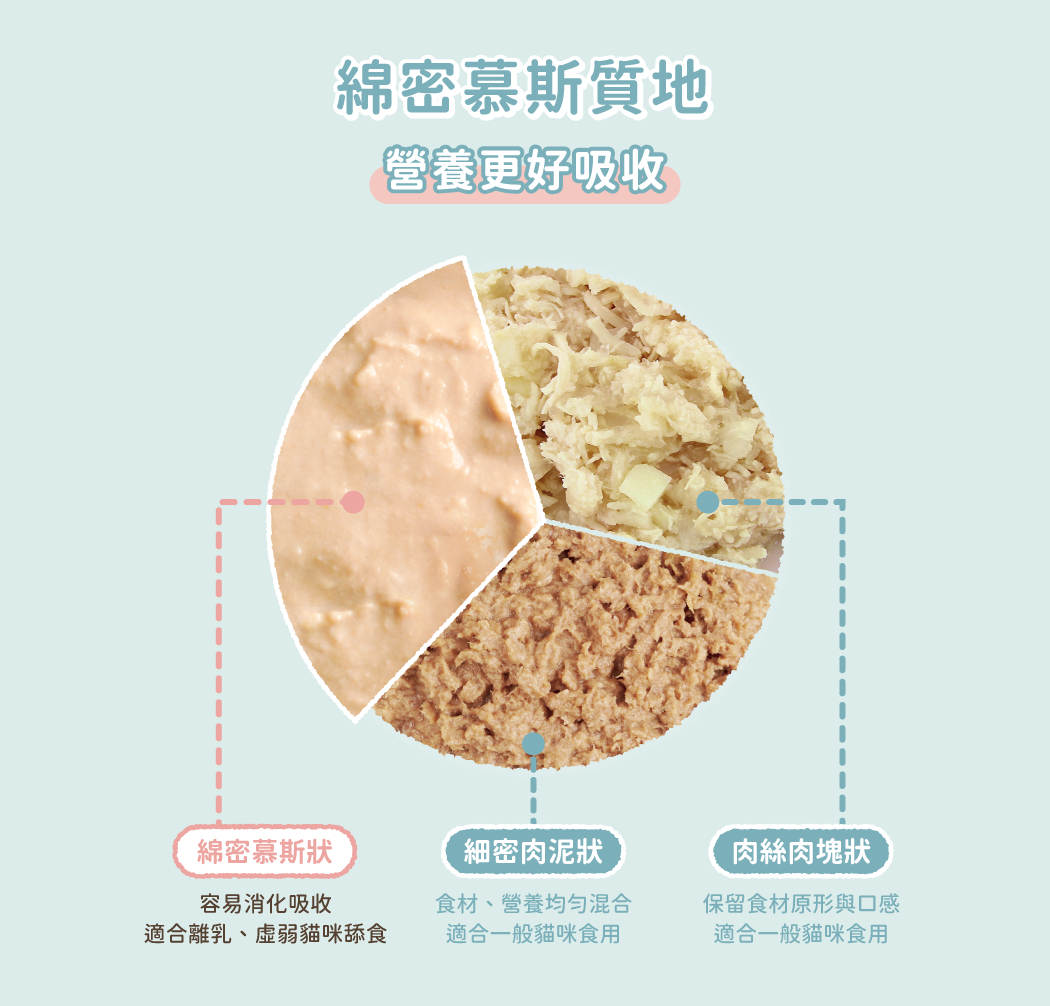 • 慕斯質地,更好進食與消化吸收