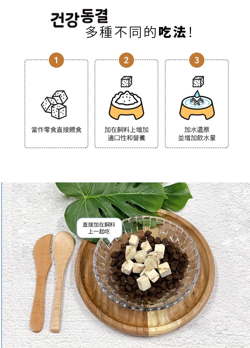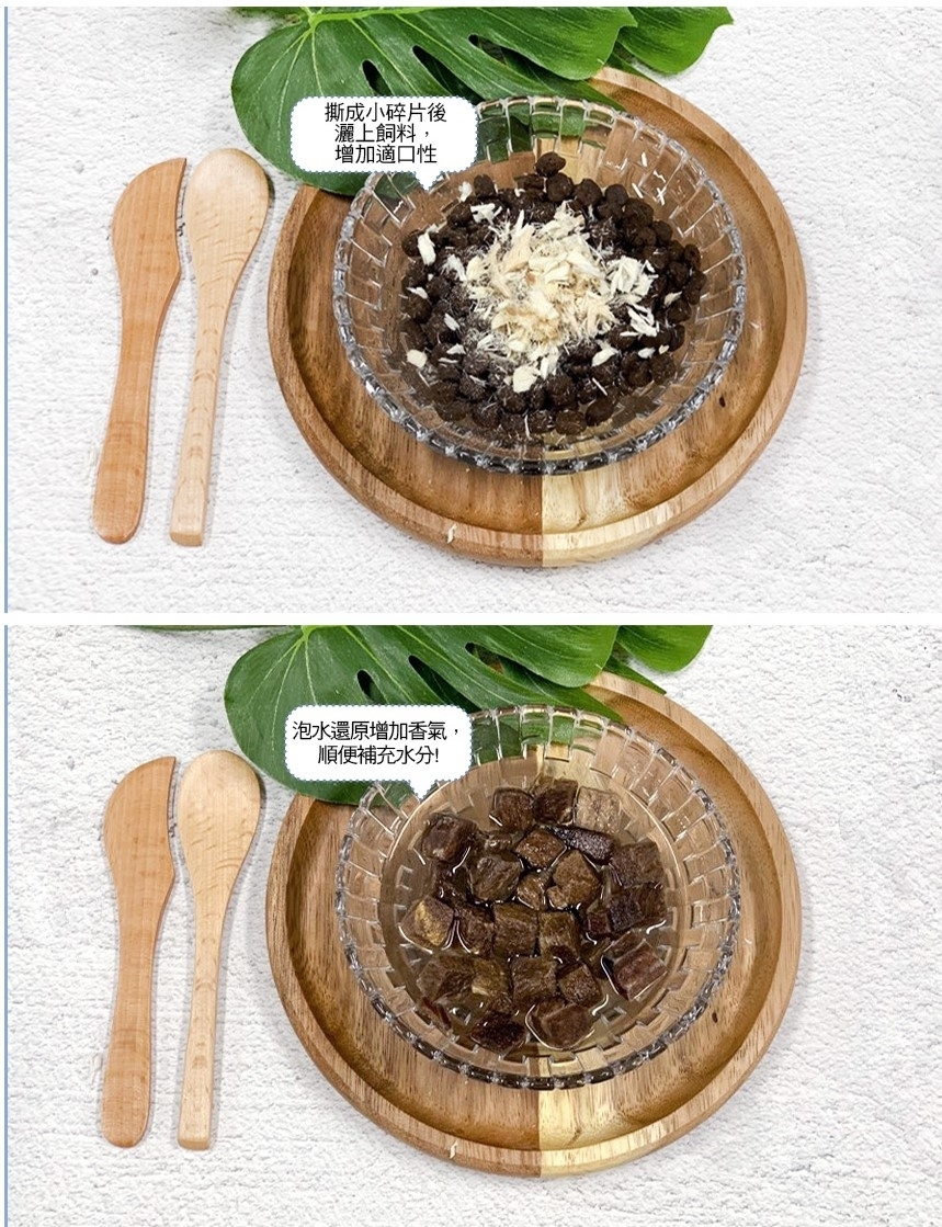 可當作零食直接餵食,或是加入溫水泡開,增加寵物的飲水量