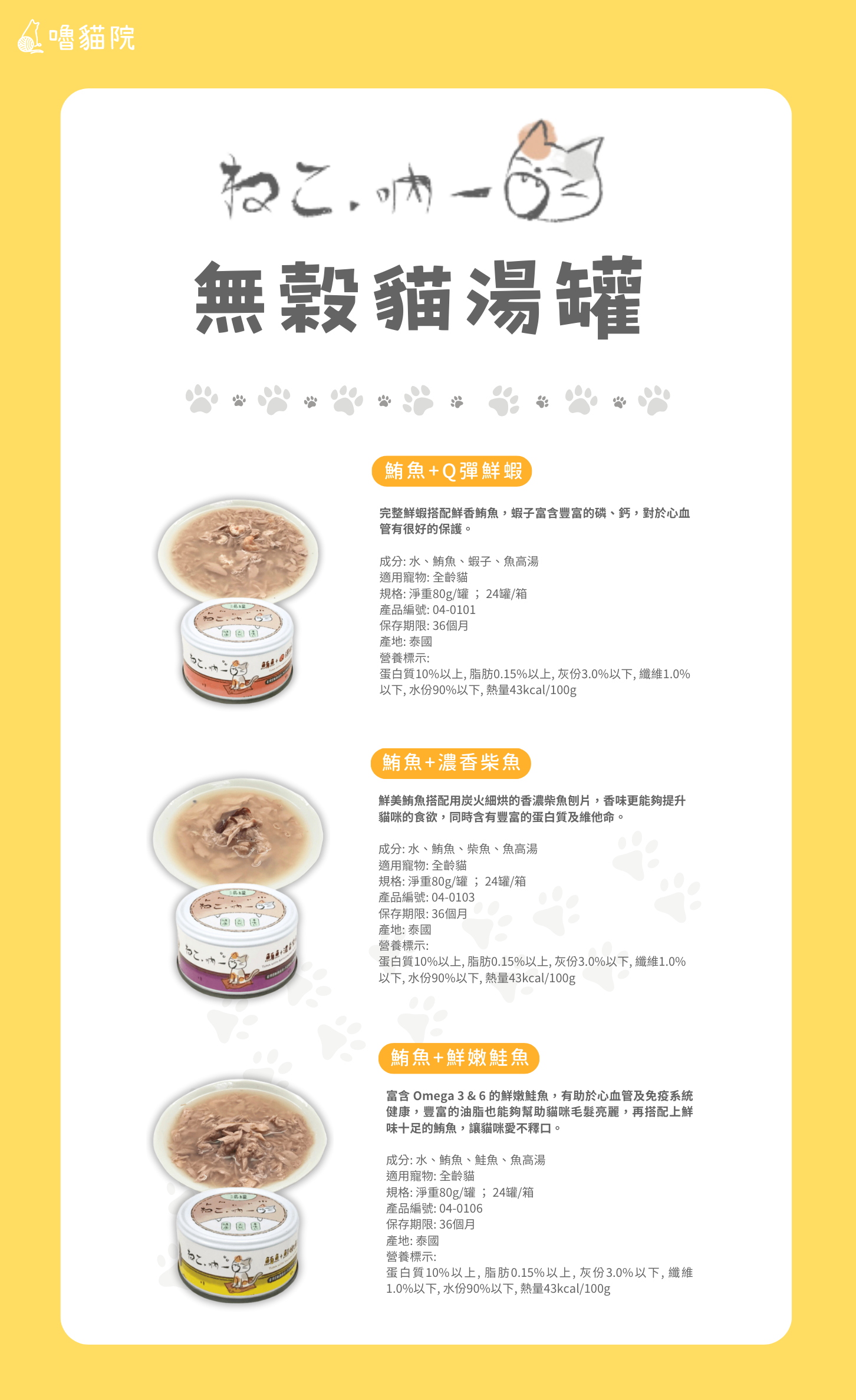 吶一口貓湯罐以鮮美的鮪魚為基底,搭配六種不同佐料,加入營養魚高湯,為貓咪補充水分。無添加人工香料、防腐劑、增稠劑及膠凍,給予最天然純粹的美味。