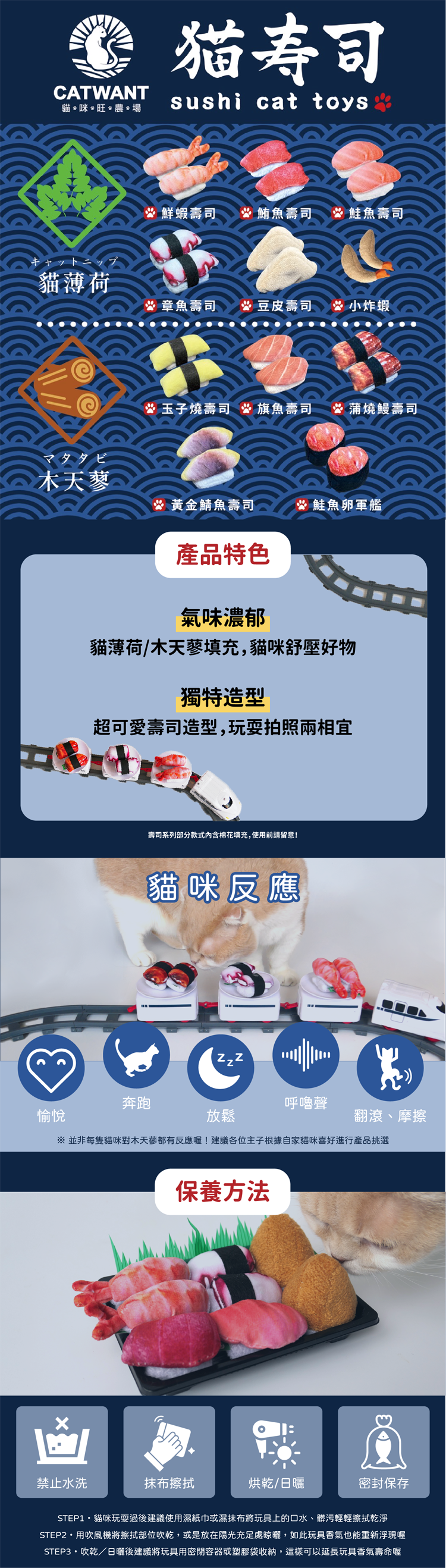 玉子燒、旗魚、蒲燒鰻魚、黃金鯖魚款成分:棉布、木天蓼、棉花