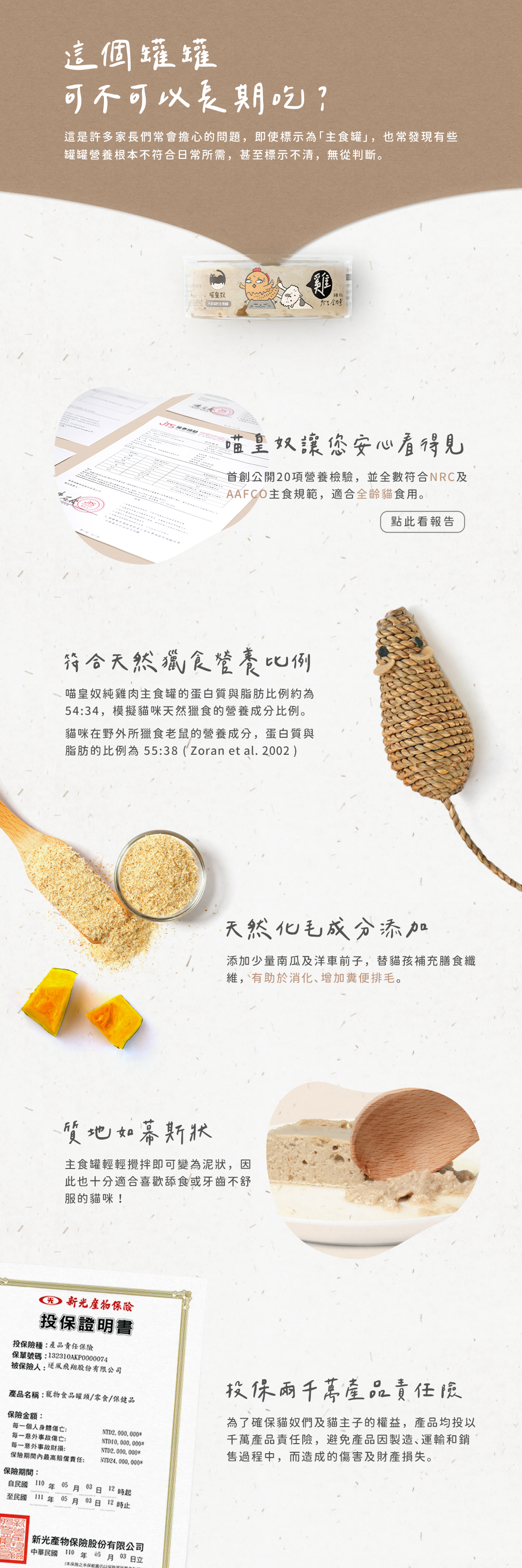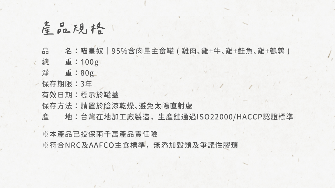 黃金比例主食罐,首創20項營養檢驗,並逐一比對並符合國際全齡貓主食標準,無穀無爭議性膠低過敏源,提供完整充足的營養素,泥狀質地適合貓貓舔食,天然化毛成分助腸胃保健,吃得健康並預防疾病,ISO22000/HACCP認證台灣工廠,投保2000萬產品責任險。
