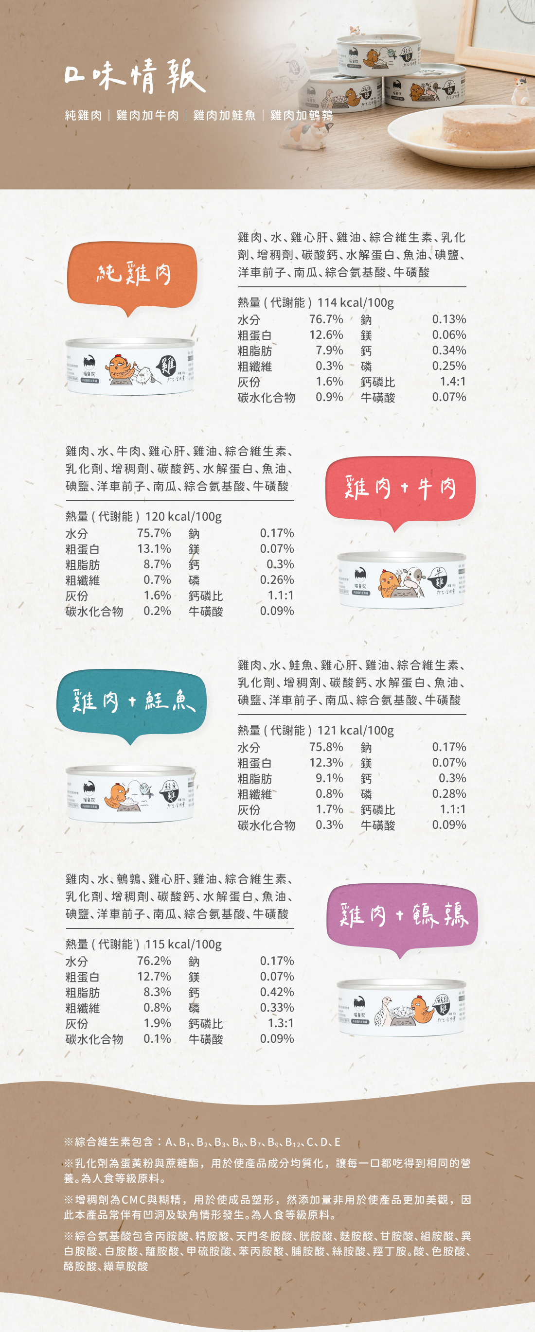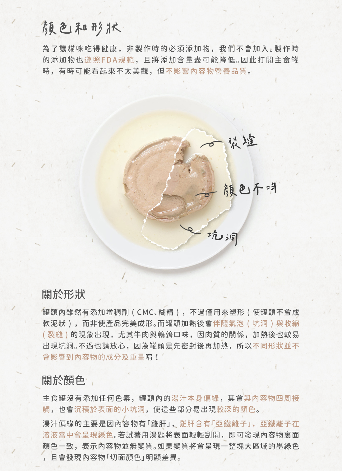 為了讓貓咪吃得健康,非製作時的必須添加物,我們不會加入。製作時的添加物也遵照FDA規範,且將添加含量盡可能降低。因此有時可能看起來不太美觀,但是不影響內容物營養品質